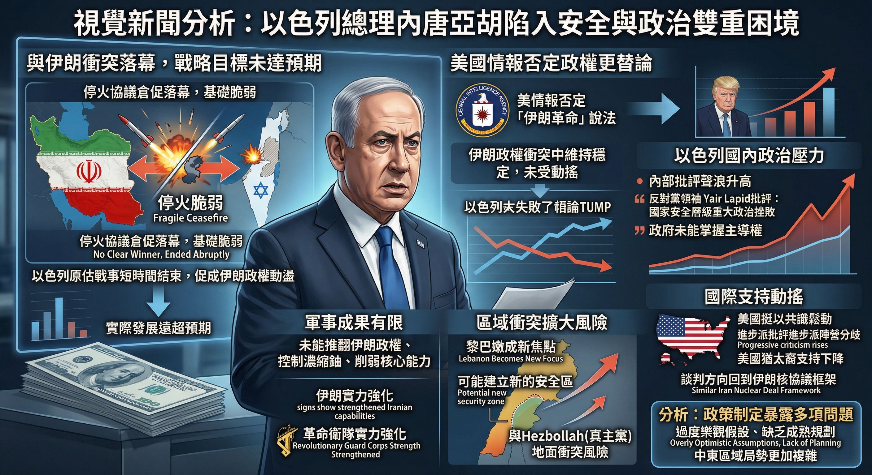 以色列總理Benjamin Netanyahu長期對伊朗採取強硬立場,並多次呼籲國際社會支持軍事行動。然而,隨著近期以美聯手對伊朗的衝突告一段落,國際媒體分析指出,這場戰爭不僅未達預期戰略目標,反而讓以色列陷入政治與安全雙重困境。