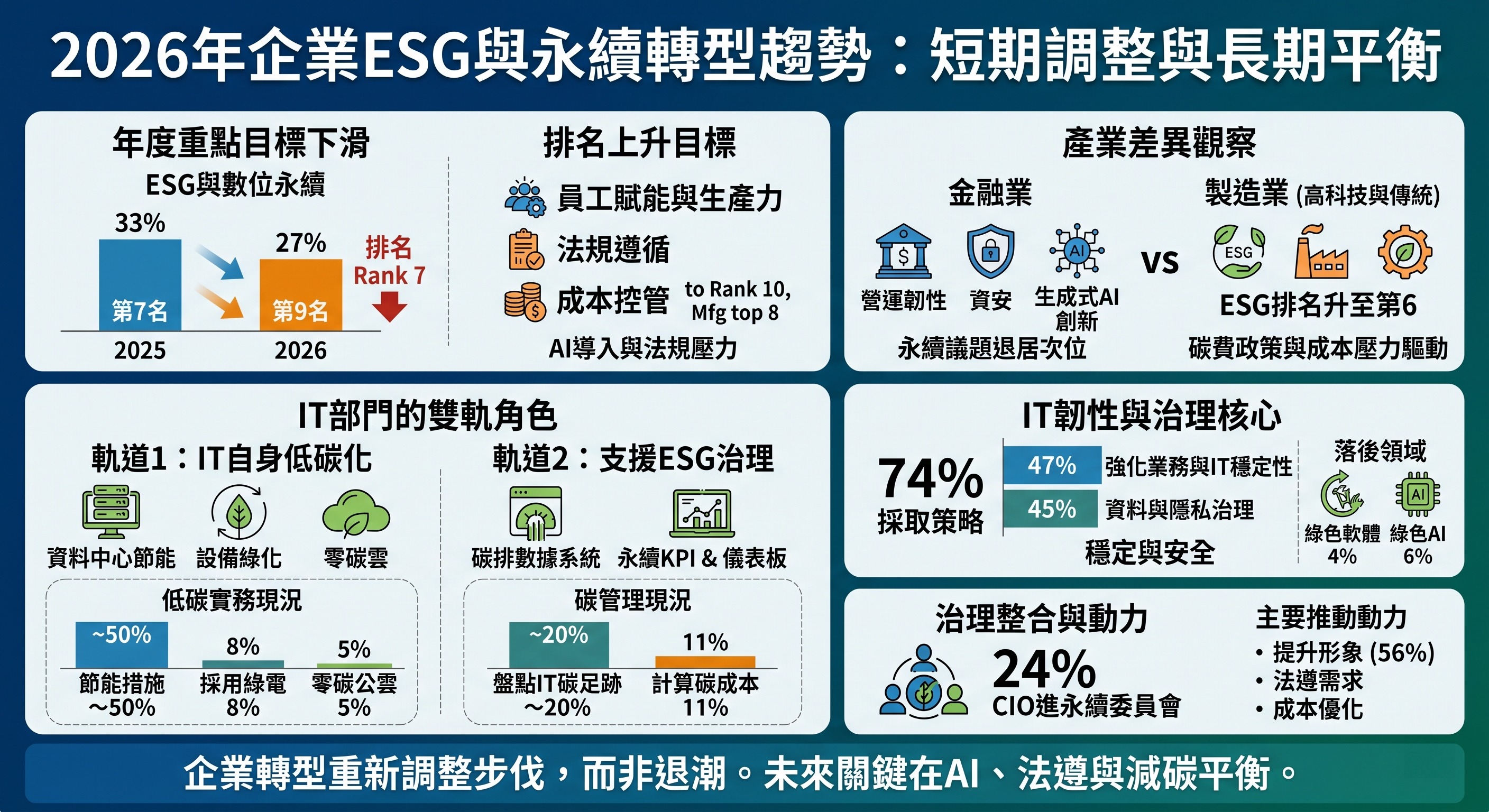 在IT部門角色方面,企業永續推動呈現「雙軌並行」。一方面著重IT自身低碳化,包括資料中心節能、設備綠化與零碳雲導入;另一方面則支援企業ESG治理,如建置碳排數據系統、設計永續KPI與儀表板。