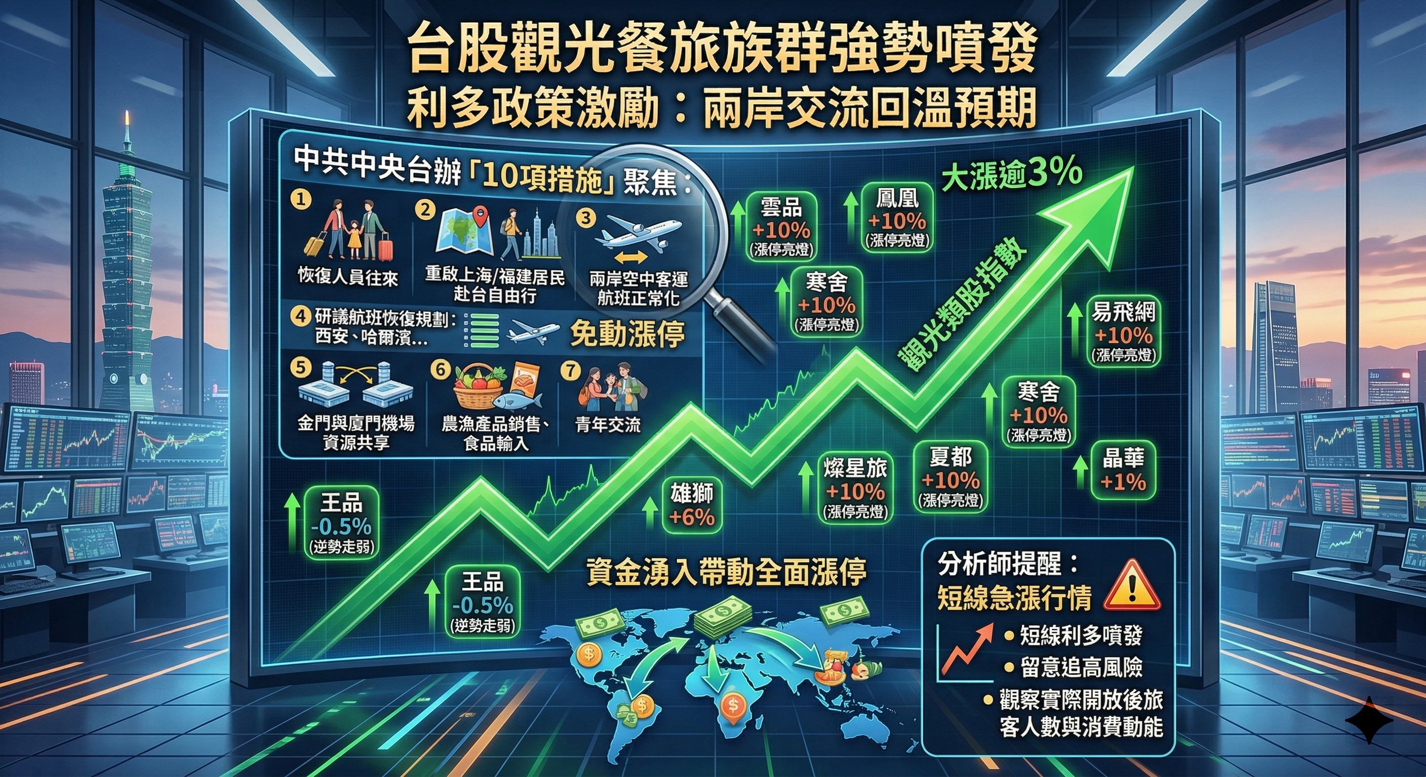 不過,市場也提醒,這類走勢多屬題材驅動,後續仍須觀察實際開放後的旅客人數與消費動能,投資人應留意追高風險,並適時調節持股。