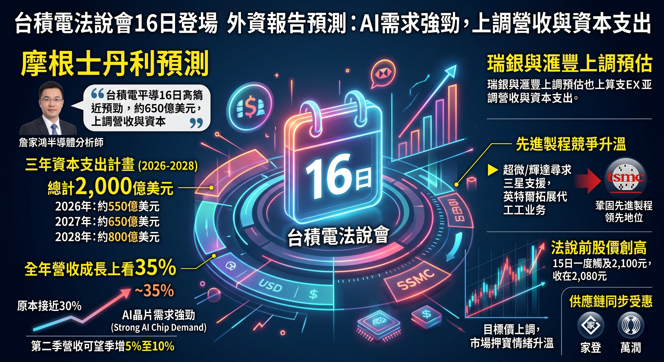晶圓代工龍頭台積電法說會將於16日登場,市場高度關注未來展望。外資龍頭摩根士丹利最新報告指出,在AI需求持續強勁帶動下,台積電不僅有望上調全年營收成長預期,更可能釋出未來三年高達2,000億美元的資本支出計畫,規模遠超過2021年提出的千億美元投資方案。