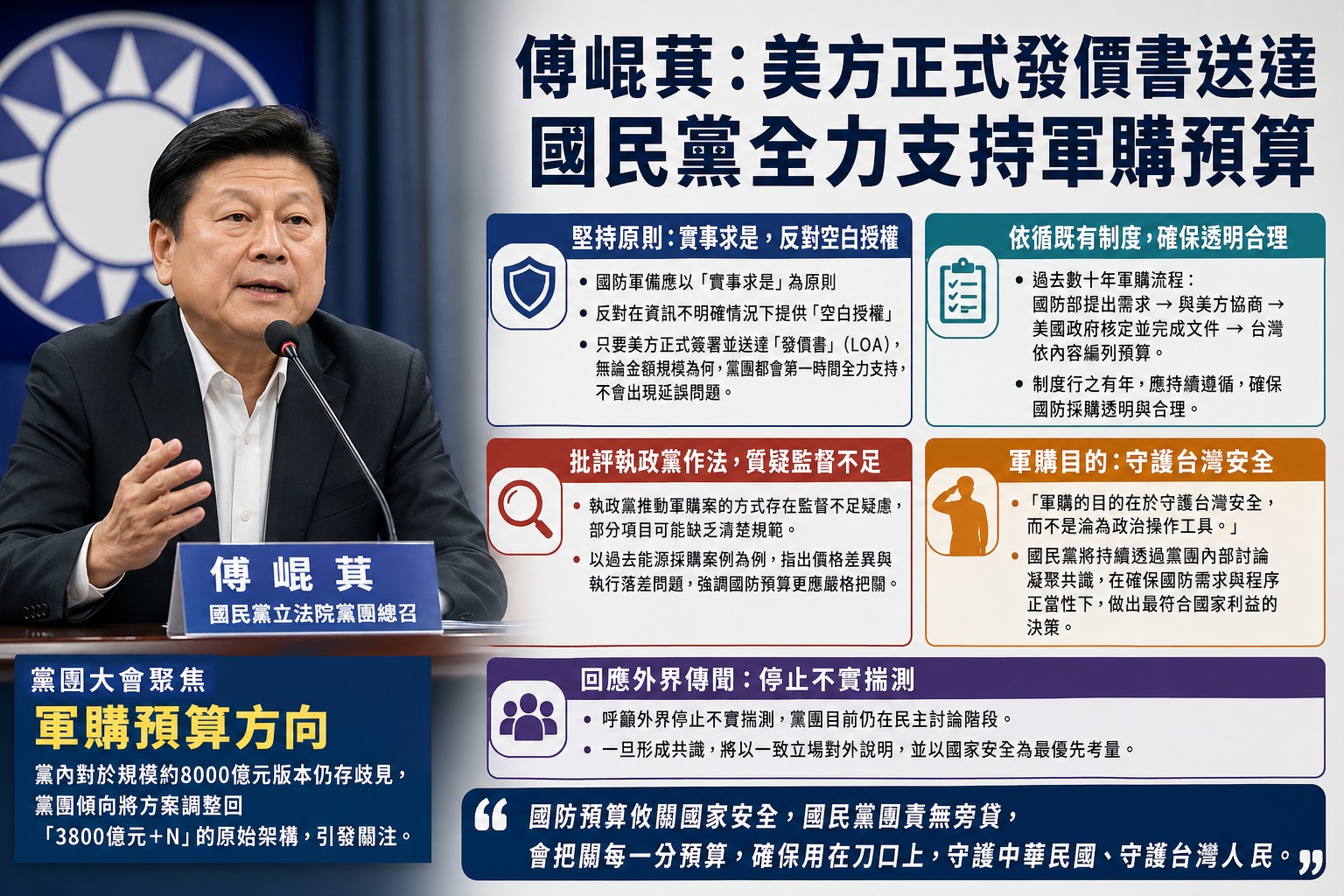 黨團總召傅崐萁會後表示,國防軍備應以「實事求是」為原則,反對在資訊不明確情況下提供所謂「空白授權」。他強調,國民黨的立場相當清楚,只要美方正式簽署並送達「發價書」(Letter of Offer and Acceptance, LOA),無論金額規模為何,黨團都會第一時間全力支持,不會出現延誤問題。