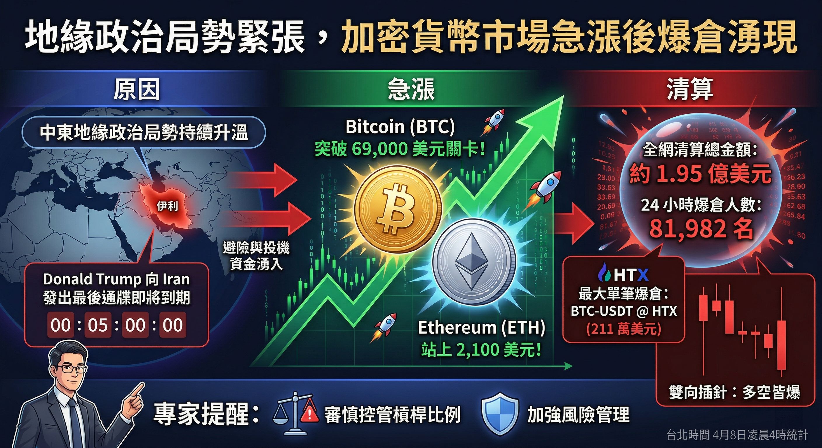截至台北時間 4月8日凌晨4時,Bitcoin(BTC)價格迅速突破 69,000美元關卡,展現強勁上漲動能;同時,第二大加密貨幣 Ethereum(ETH)也同步走高,價格一度站上 2,100美元。