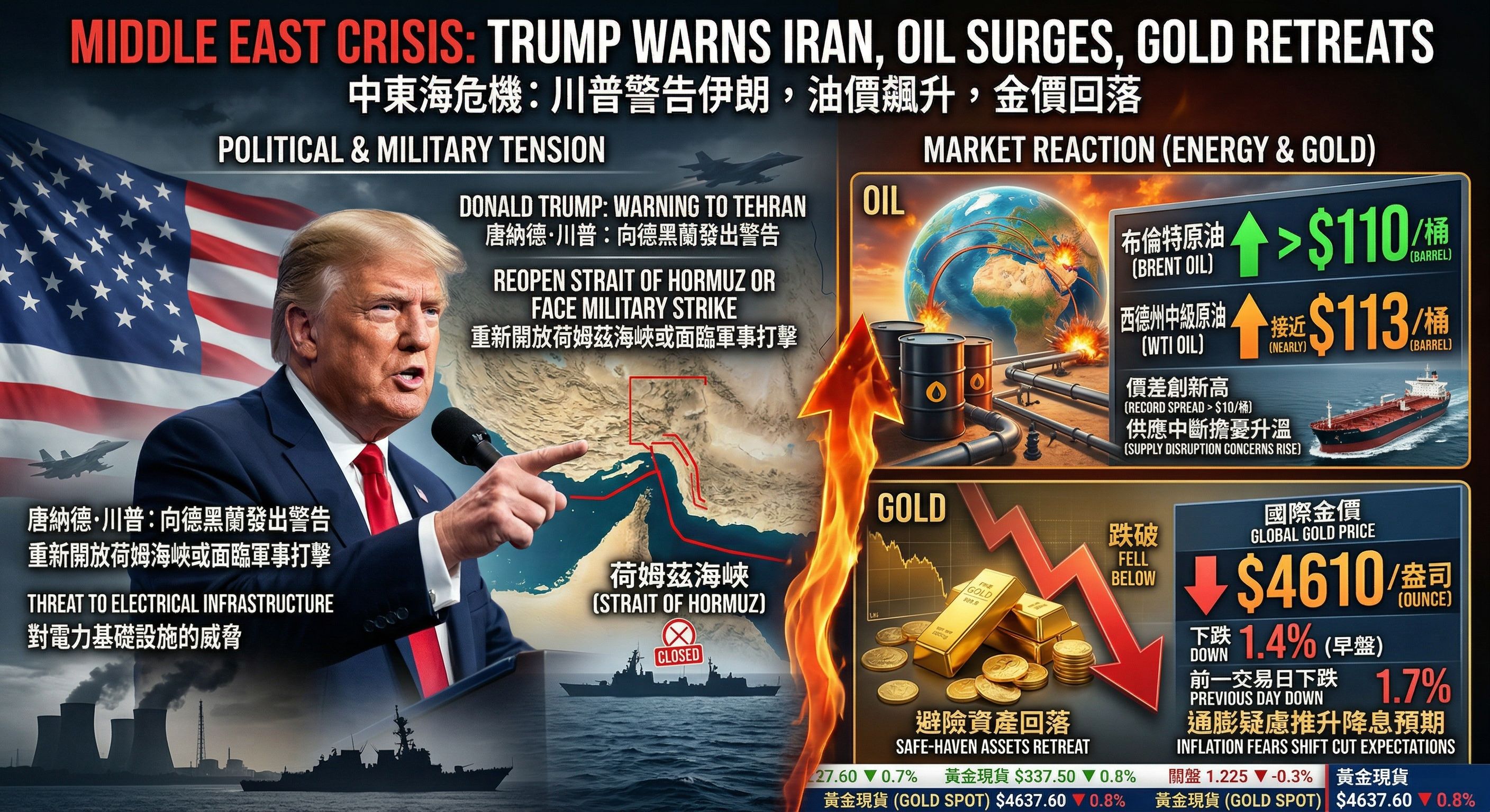 隨著中東局勢持續升溫,Donald Trump再度向伊朗發出強硬警告,要求德黑蘭當局重新開放荷姆茲海峽。由於伊朗方面未顯示結束衝突的跡象,市場對能源供應中斷的憂慮升高,國際油價6日大幅攀升,布倫特原油突破每桶110美元,同時國際金價則出現回落。