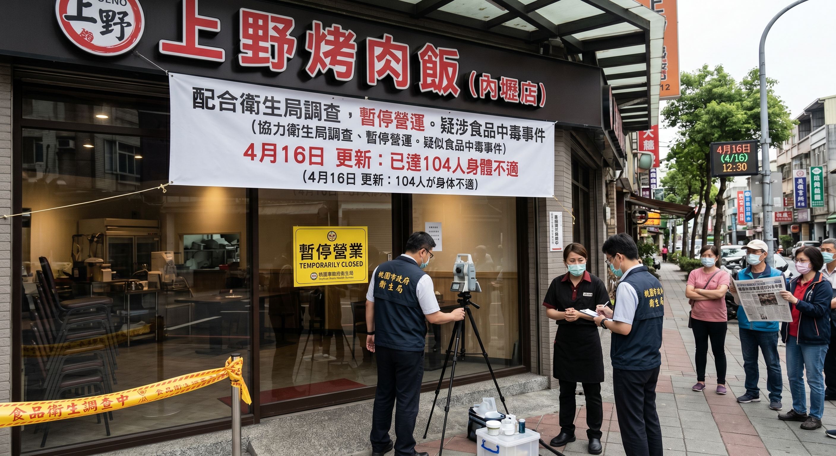 桃園市驚傳疑似食品中毒事件。位於內壢的上野烤肉飯內壢店近日遭通報多起用餐後身體不適案例,截至今(16)日中午,桃園市政府衛生局統計已有104人出現症狀,其中69人已就醫,引發社會高度關注。