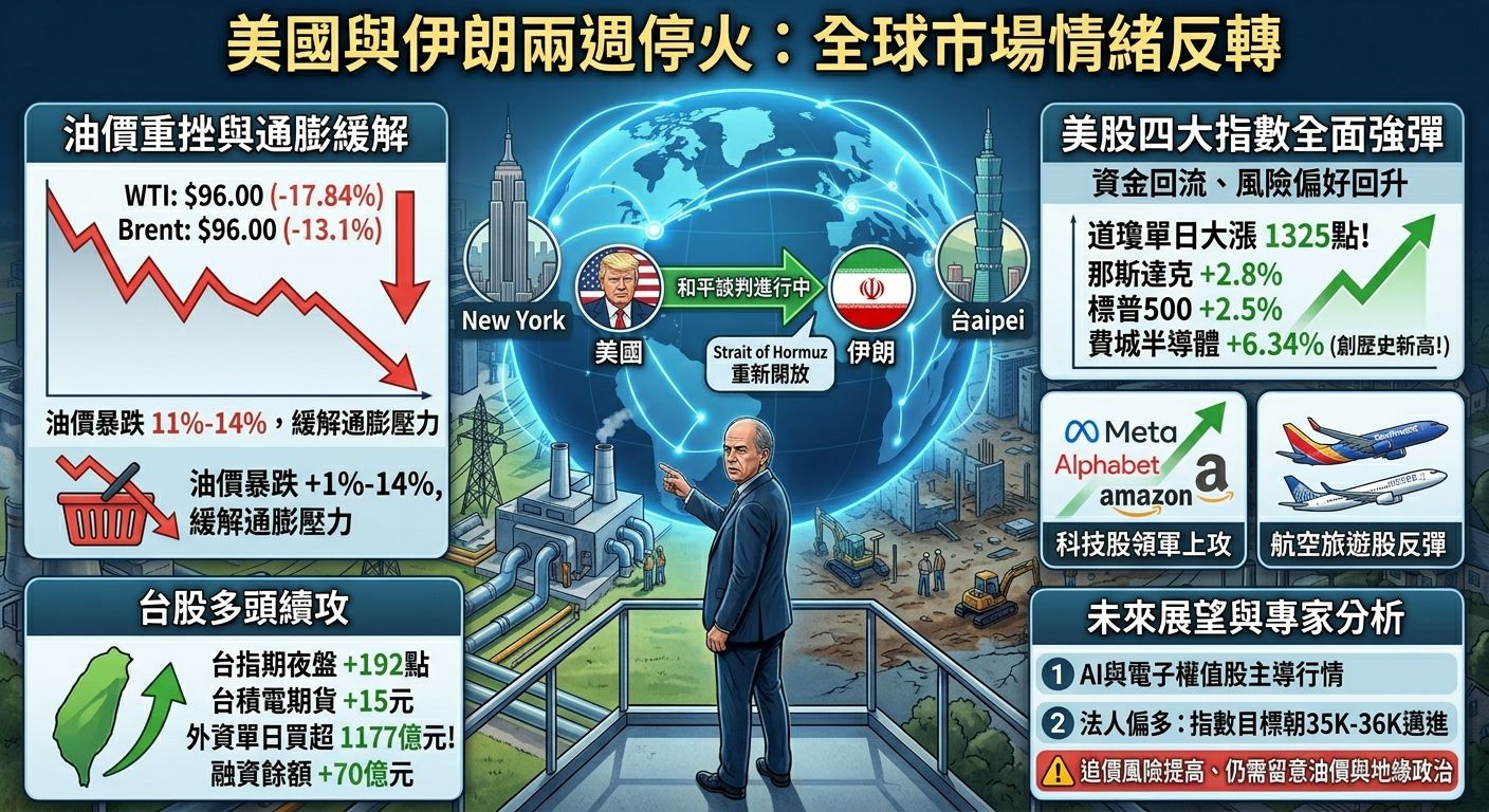 美國與伊朗達成為期兩週的停火協議,中東緊張局勢暫時降溫,市場避險情緒快速消退。國際油價隨之重挫,激勵全球股市同步走高,道瓊工業指數單日大漲逾1300點,科技股領軍上攻,帶動市場風險偏好明顯回升。