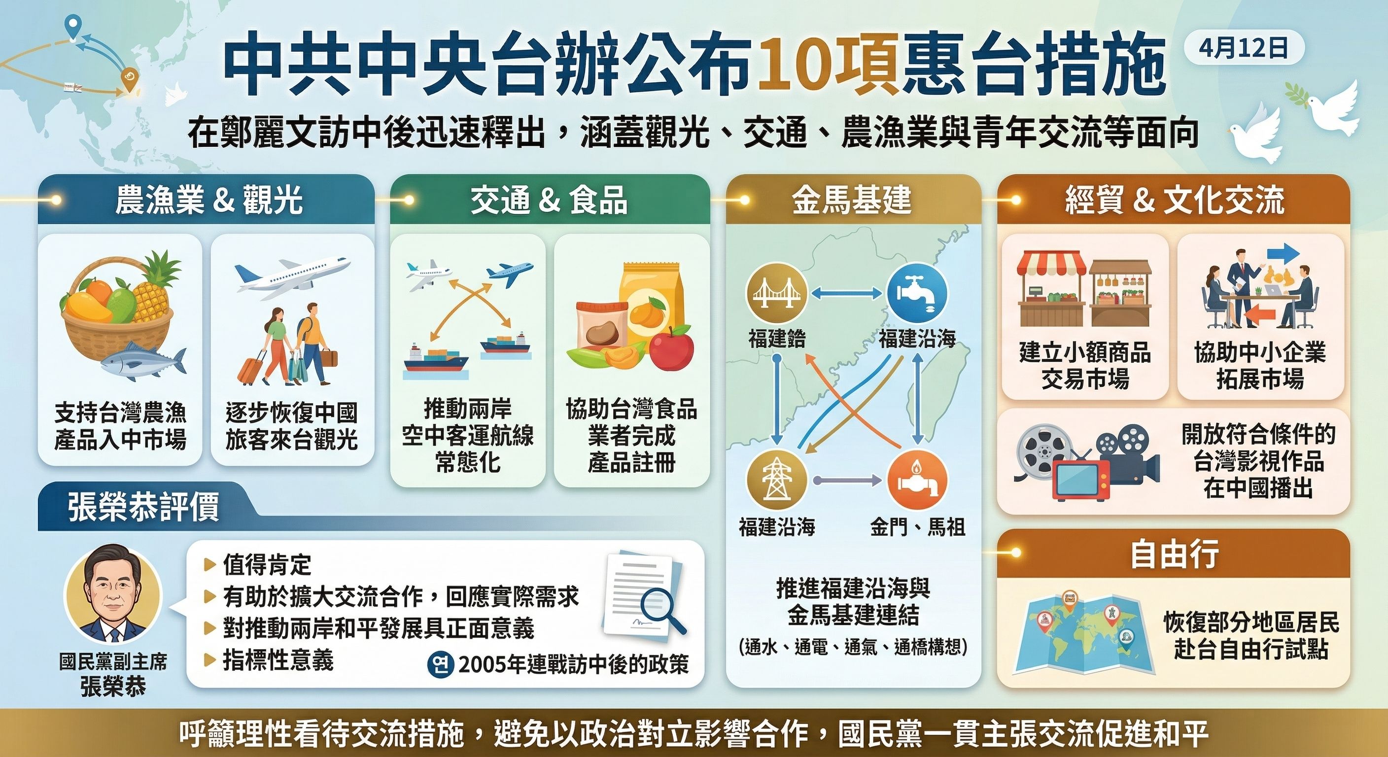 在產業與經貿方面,中方提出協助台灣食品業者完成產品註冊、建立小額商品交易市場,以及協助中小企業拓展市場;文化領域則包括開放符合條件的台灣影視作品在中國播出,同時恢復部分地區居民赴台自由行試點。