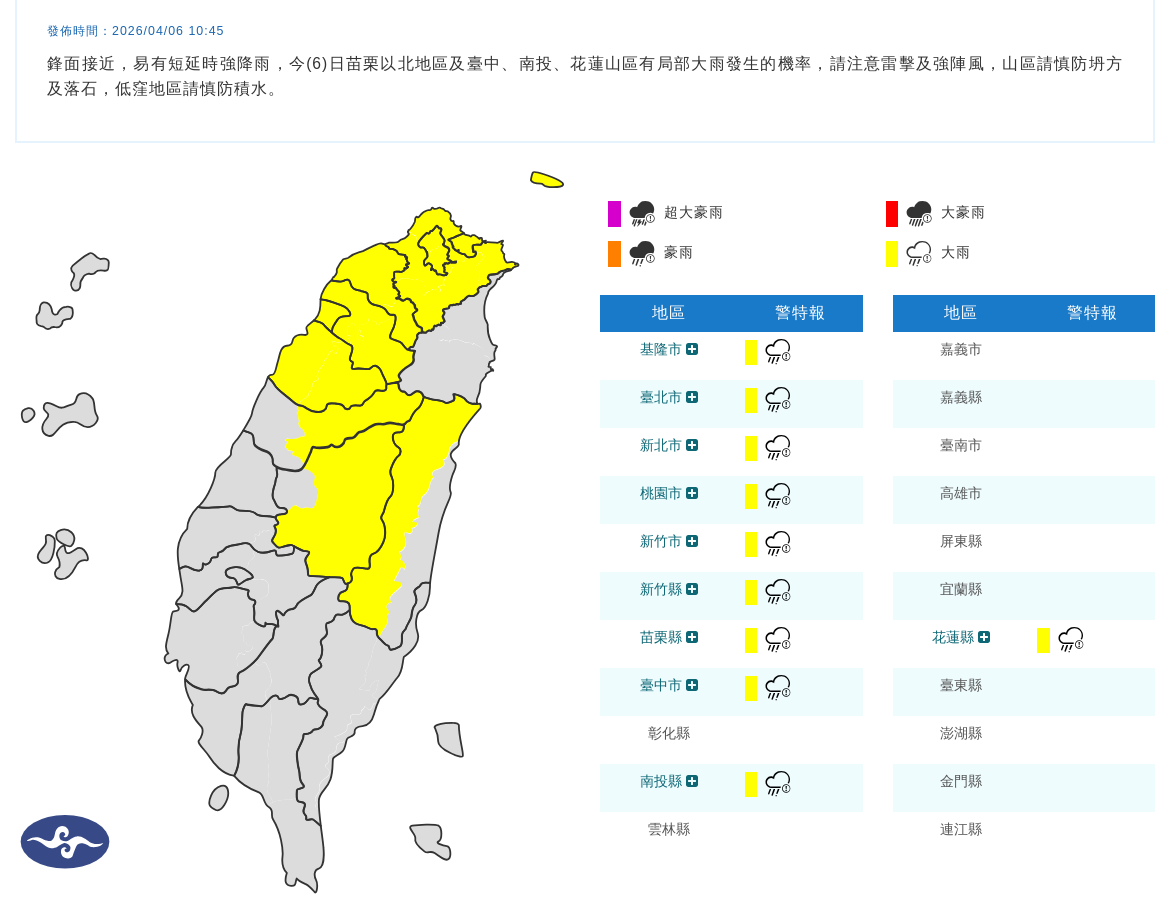 受到鋒面接近影響,中央氣象署今(6)日清晨針對北部7縣市發布大雨特報,提醒苗栗以北地區可能出現局部大雨,民眾需留意雷擊、強陣風及短延時強降雨。山區應慎防坍方與落石,低窪地區則需注意積水情形。