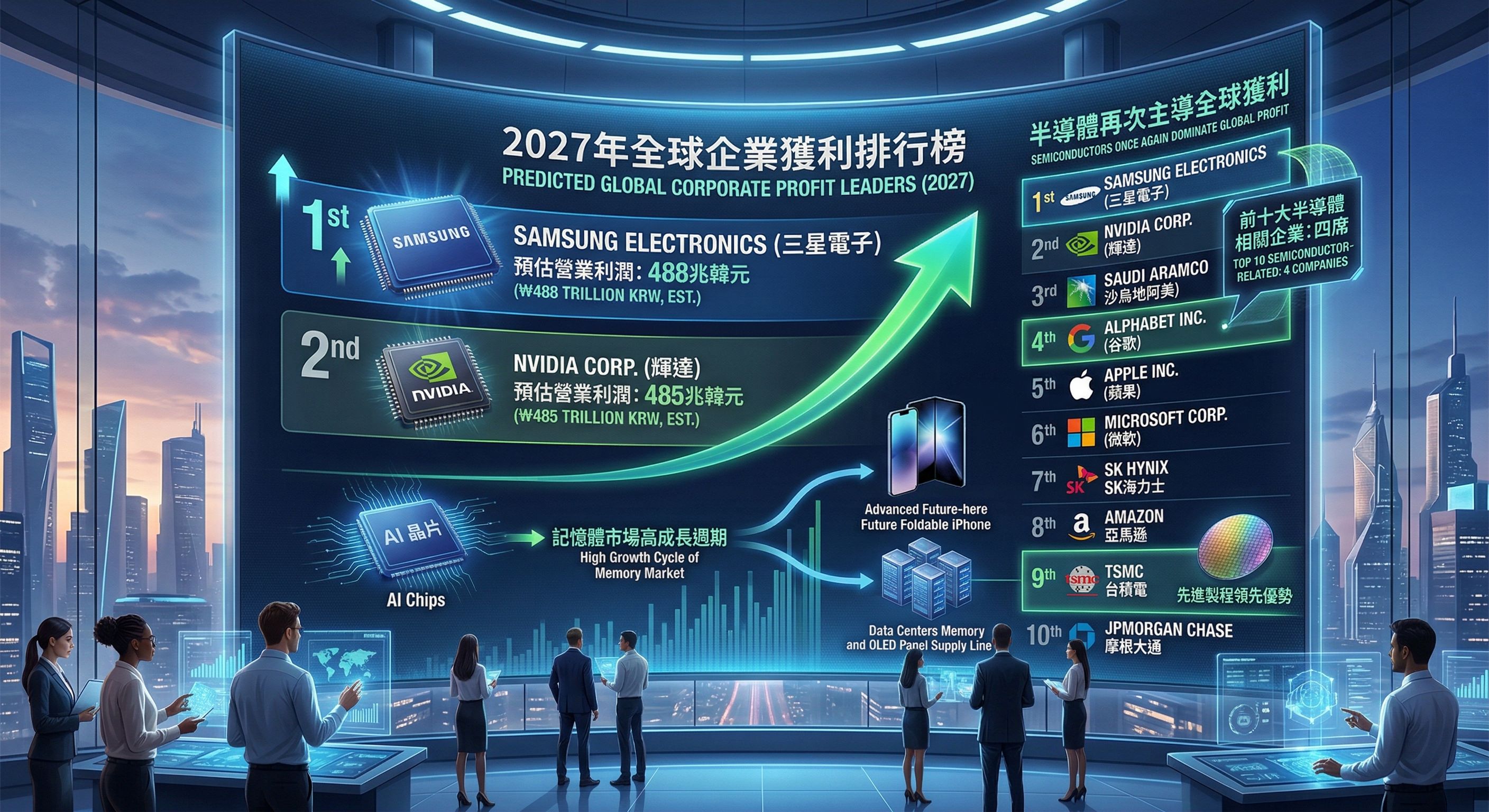全球半導體產業版圖恐將出現重大洗牌。根據南韓 KB Securities 最新研究報告指出,隨著記憶體市場進入高成長週期,Samsung Electronics 有望在2027年重返全球企業獲利龍頭地位,甚至超越AI晶片霸主 NVIDIA。