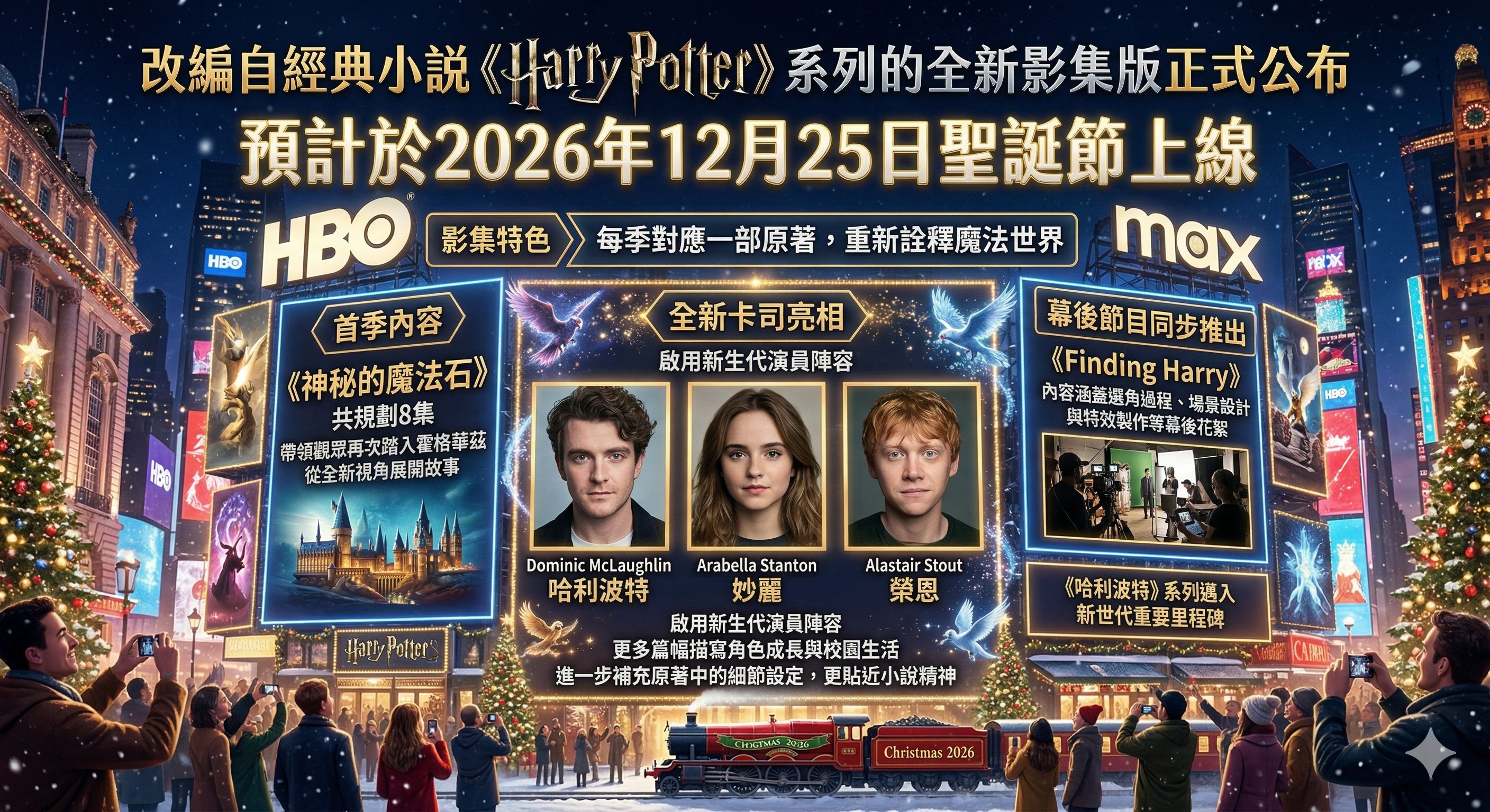 【綜合報導】改編自經典小說《Harry Potter》系列的全新影集版正式公布,由 HBO 打造,預計於2026年12月25日聖誕節上線。此次影集將採「每季對應一部原著」的形式進行改編,重新詮釋魔法世界。