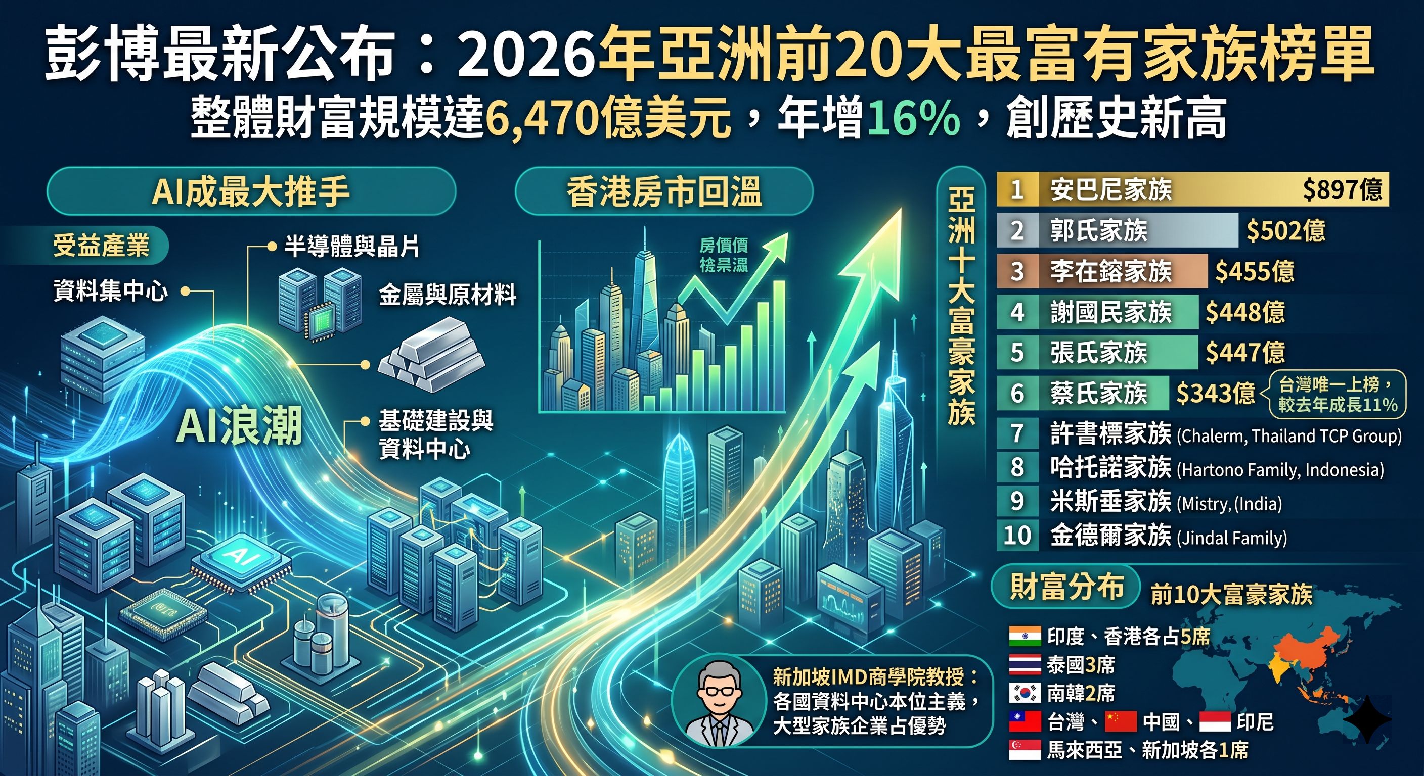彭博最新公布「2026年亞洲前20大最富有家族」榜單,整體財富規模年增16%,達到6,470億美元,創歷史新高。市場分析指出,人工智慧(AI)浪潮與香港房市回溫,是推升資產暴增的兩大關鍵動能。