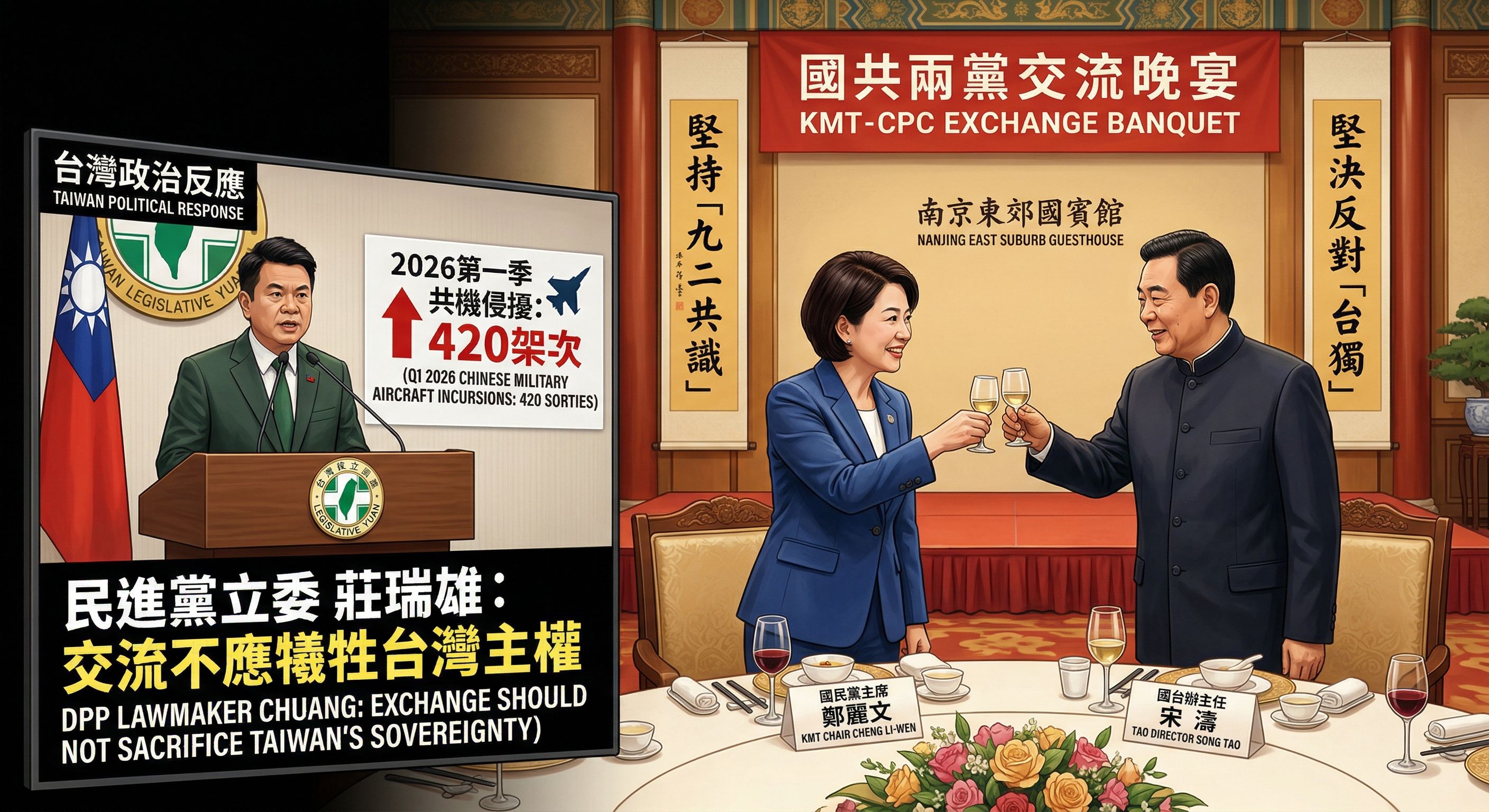 民進黨立法院黨團幹事長莊瑞雄表示,僅在2026年第一季,中國軍機侵擾台灣空域的架次就達420架次。他指出,民進黨並不反對兩岸正常交流,但強調交流不應以犧牲台灣主權作為條件。