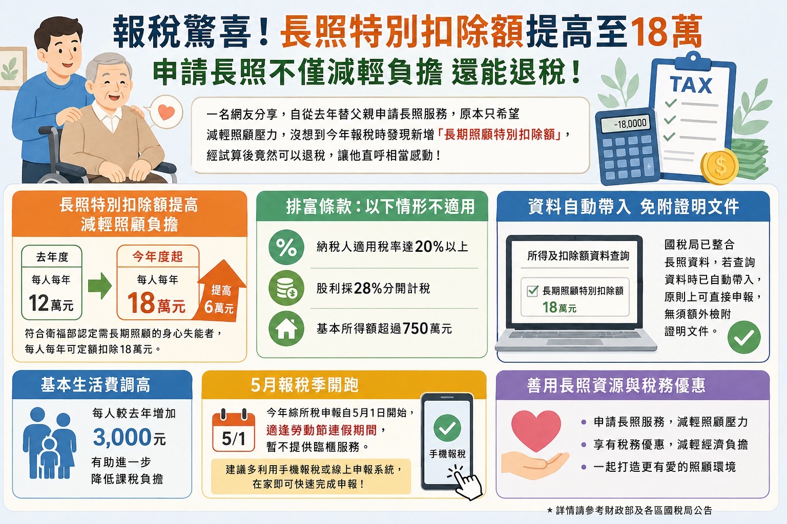 事實上,為減輕照顧身心失能者家庭的經濟負擔,今年「長期照顧特別扣除額」已由原本每人每年12萬元,提高至18萬元,成為報稅新制中的重要利多之一。