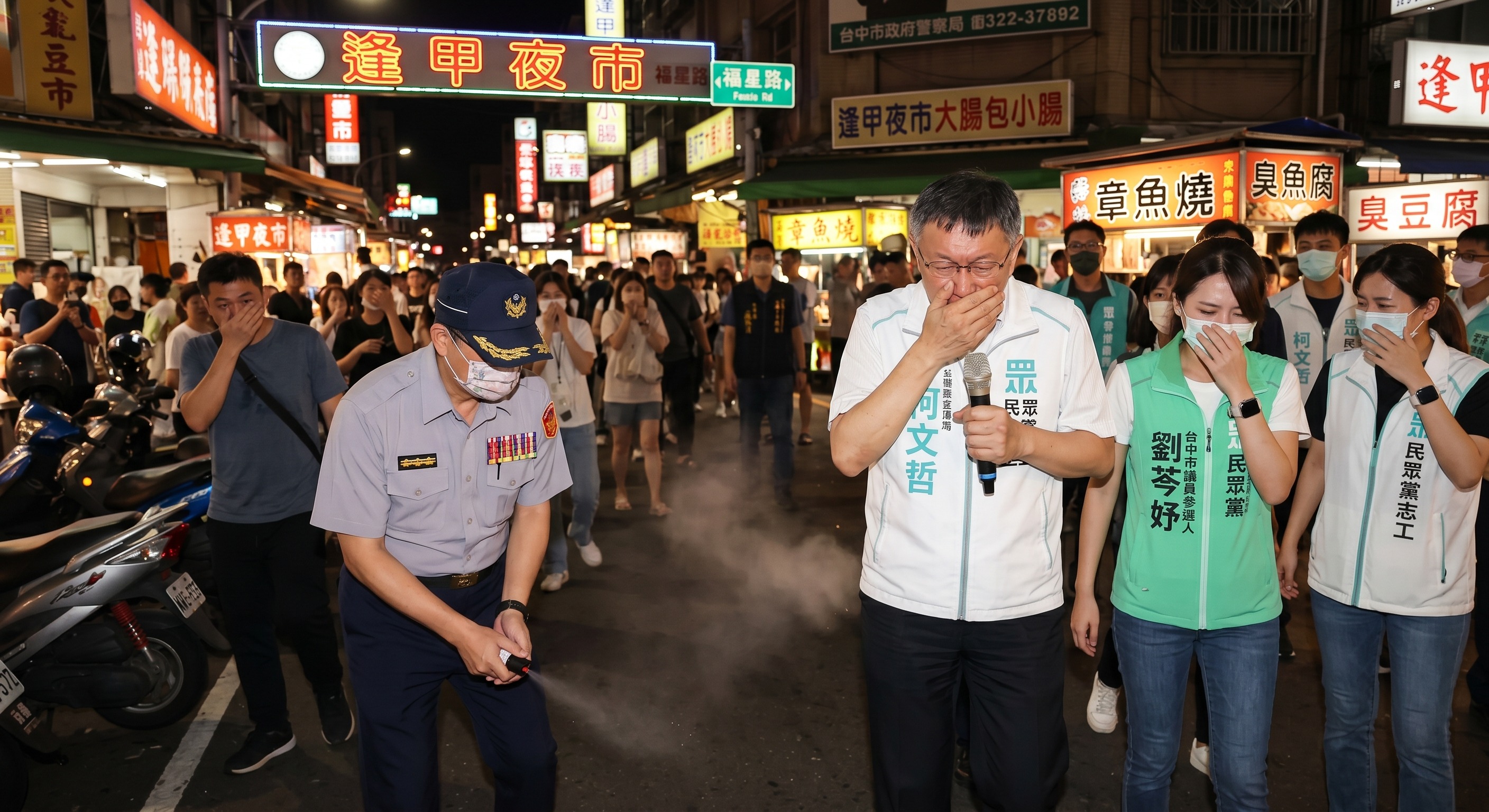 事件發生於17日晚間,柯文哲陪同台中市議員參選人劉芩妤於逢甲夜市進行拜票行程,期間突有刺激性氣體瀰漫,導致柯文哲、劉芩妤及多名志工與民眾出現不適反應,現場一度陷入混亂。劉芩妤事後提告傷害罪,警方隨即成立專案小組展開調查。