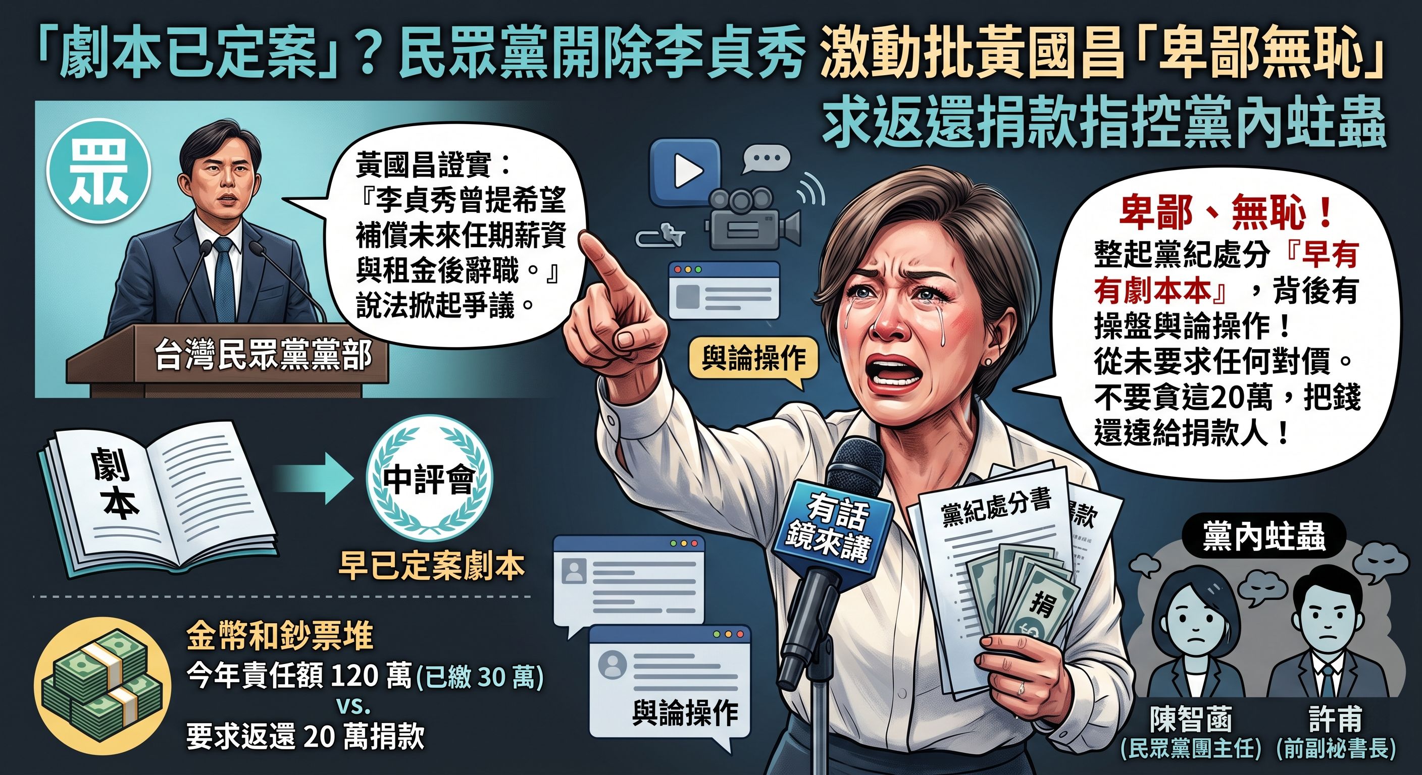 李貞秀14日登上網路節目《有話鏡來講》親自回應事件始末,情緒激動批評黃國昌「卑鄙、無恥」,並指控整起黨紀處分「早有劇本」,質疑背後存在操盤與輿論操作。她直言,在出席中評會時便感受到結果早已定案,整體過程讓她難以接受。