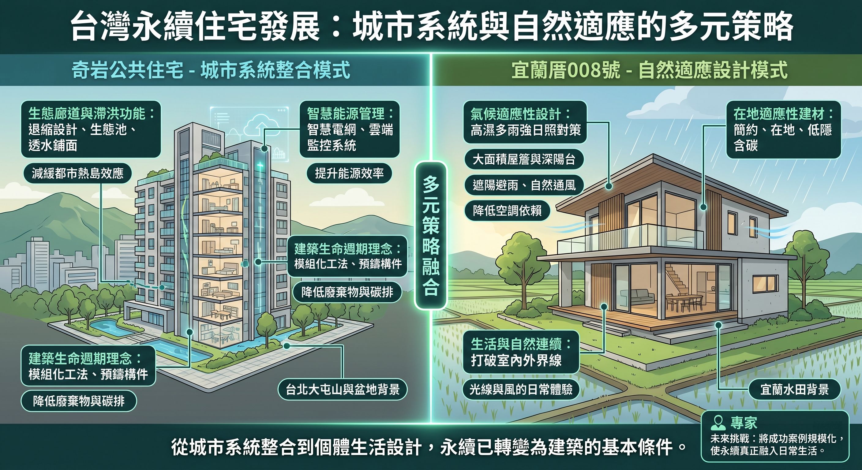 兩種不同模式反映出當前永續住宅發展的重要趨勢:不再追求單一解方,而是依據環境條件與使用需求,採取多元策略。從城市系統整合到個體生活設計,永續已逐漸從附加價值轉變為建築的基本條件。