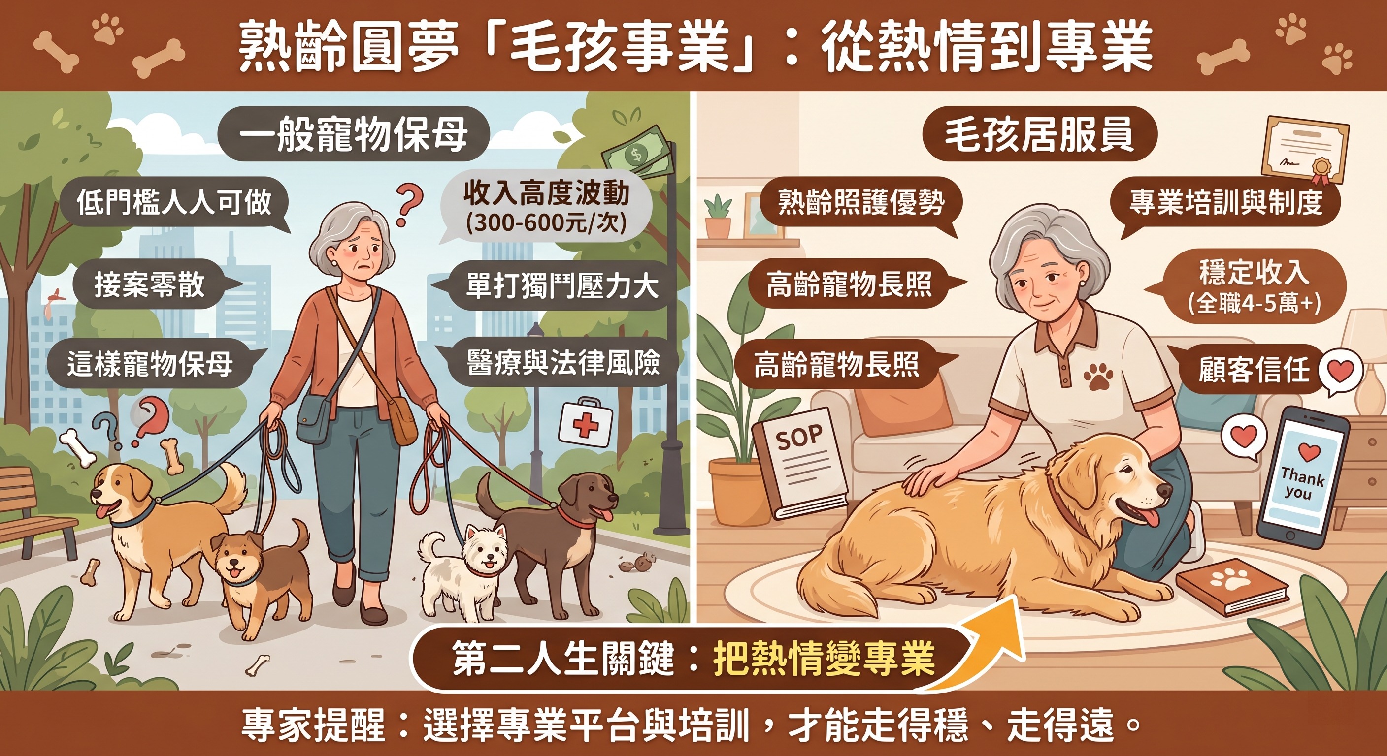 目前市場上的寵物保母服務,多以到府餵食、陪伴及遛狗為主,只需透過平台登記即可接案,進入門檻極低。然而,也正因為「人人可做」,導致競爭激烈、價格浮動大。一般行情約為30分鐘300至600元,但多屬零星接案,案源不穩,收入難以長期維持。許多熟齡族誤以為這是一份輕鬆又療癒的工作,實際上更像「個人創業」,需自行承擔客源開發、行銷曝光與客訴風險。