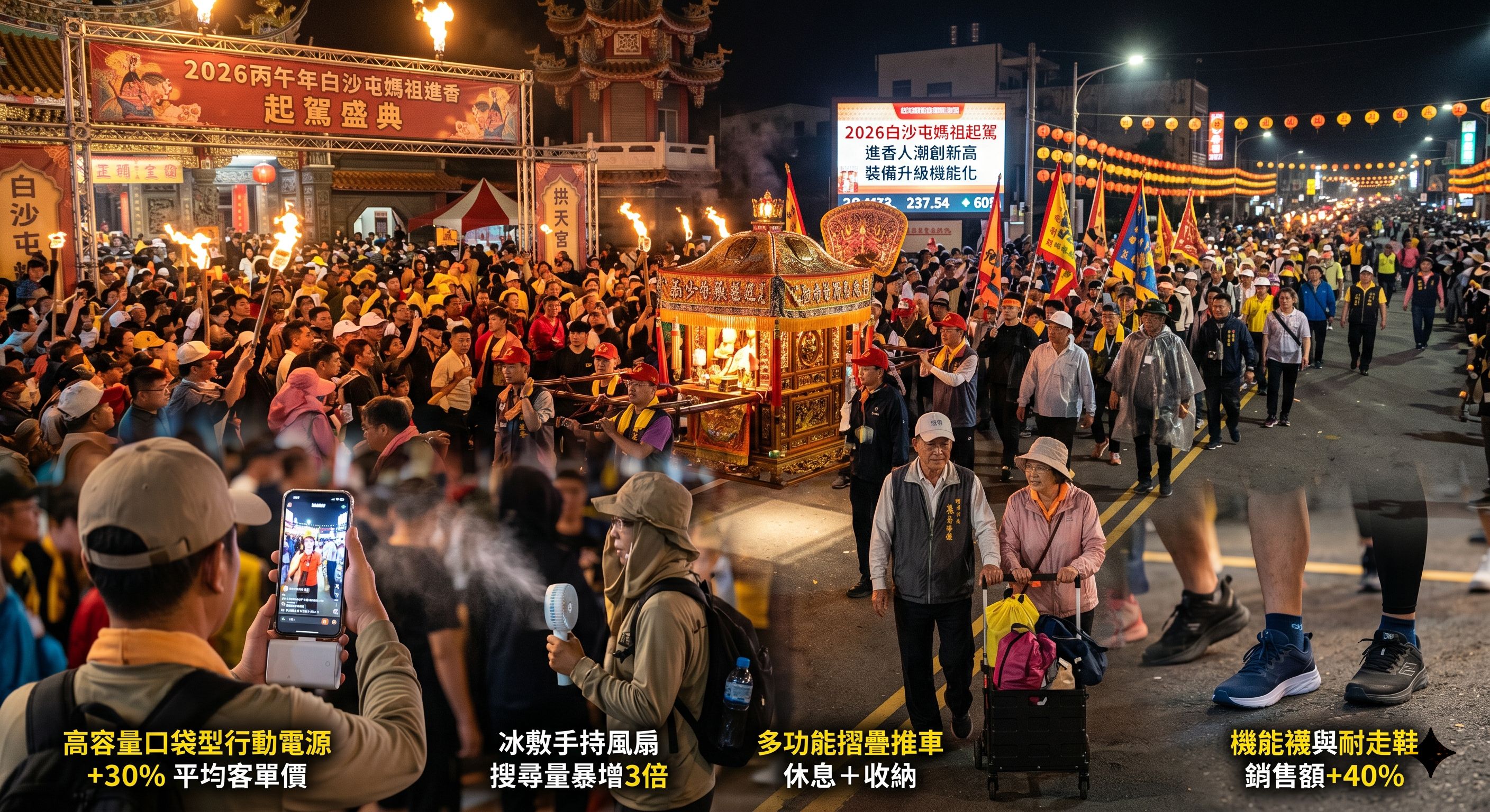 2026年白沙屯媽祖進香已於12日晚間正式起駕,展開為期8天7夜的徒步行程,吸引大批信徒參與。隨著進香人潮年年創新高,相關「遶境裝備」也成為熱門話題,電商平台觀察指出,今年實用型與機能型商品銷量明顯成長。