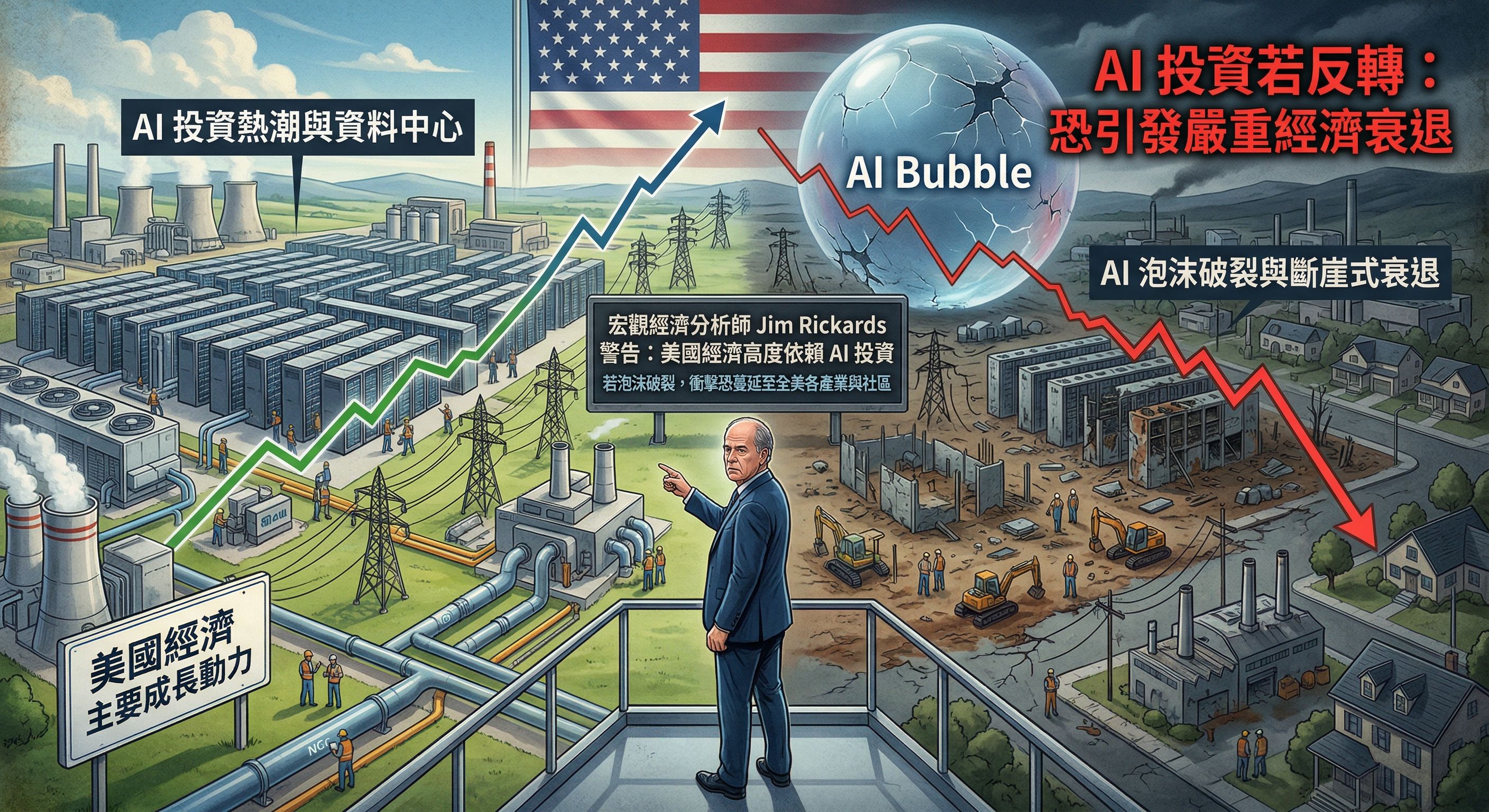 知名宏觀經濟分析師 Jim Rickards 近日發出警告指出,美國近年經濟成長正高度依賴人工智慧(AI)投資。若未來AI投資熱潮出現反轉,相關泡沫一旦破裂,衝擊恐將蔓延至全美各產業與社區,甚至引發新一波嚴重經濟衰退。