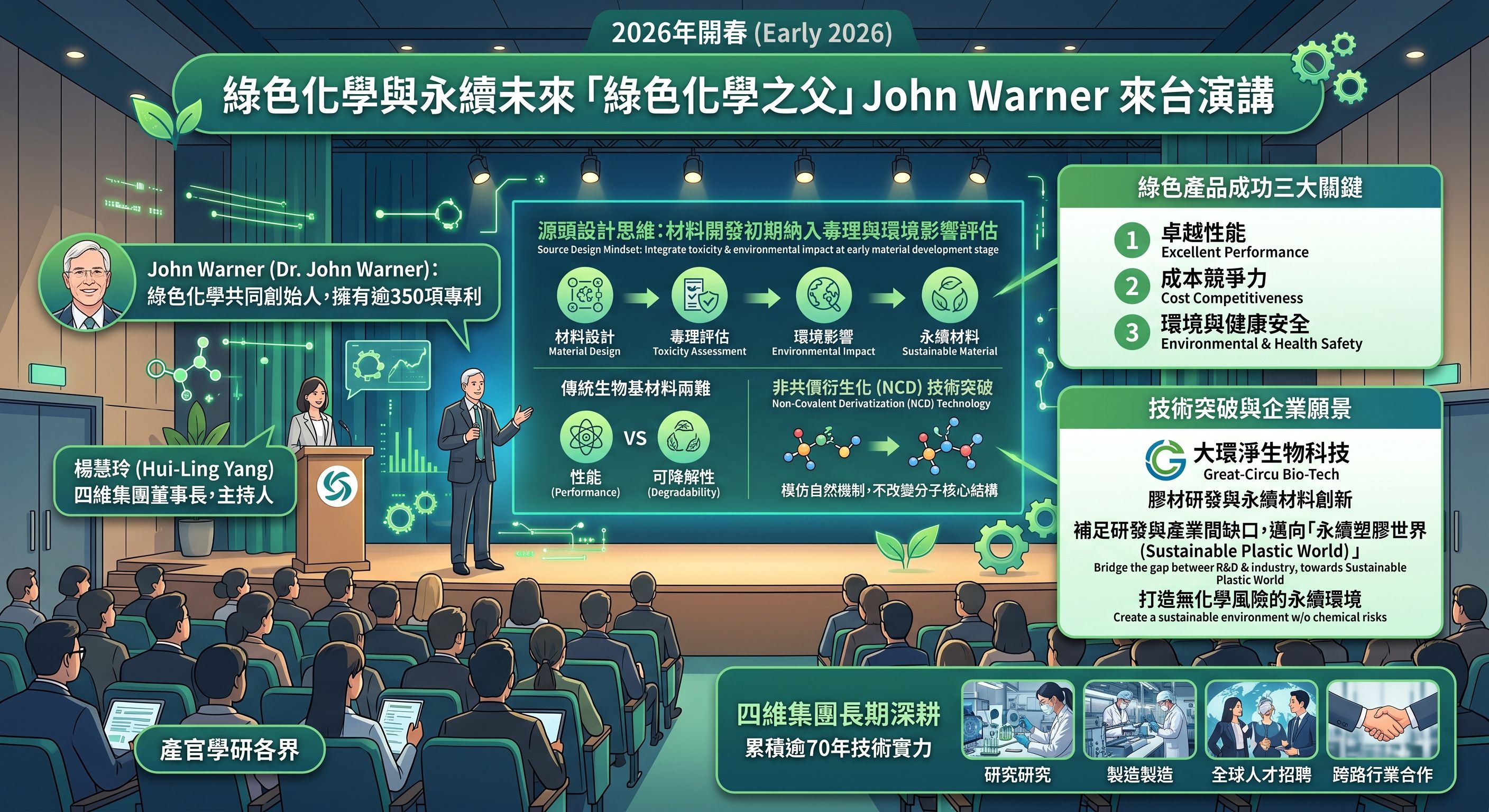 2026年開春,台灣化學材料產業迎來一場指標性國際交流盛會。四維集團旗下子公司大環淨生物科技舉辦「綠色化學與永續未來」專題研討會,邀請有「綠色化學之父」之稱的John Warner(Dr. John Warner)親自來台演講,吸引產官學研各界高度關注。